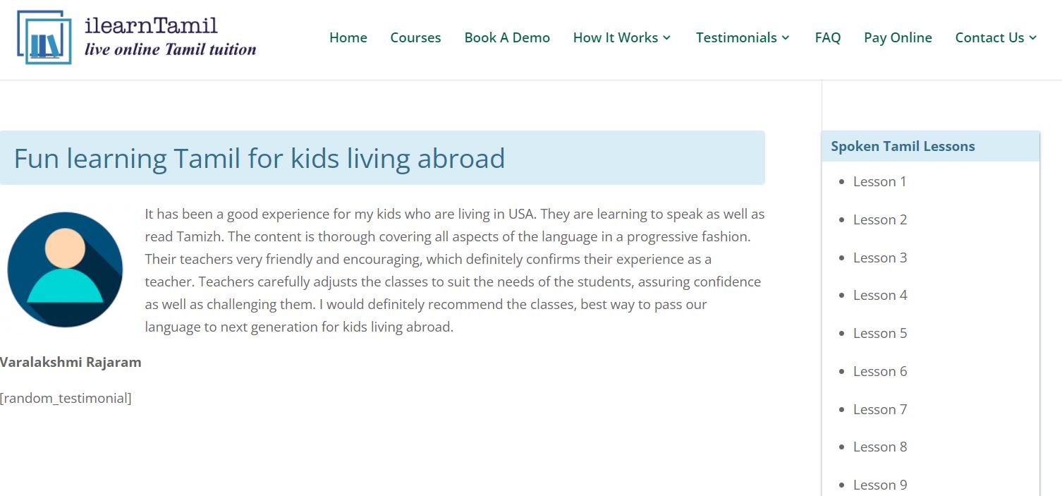In IlearnTamil they have a list of 10 lessons, especially for spoken Tamil. They even covered Aathichudi, Thirukural, Tamil grammar, and Tamil proverbs all free resources. You can book free or paid online classes to learn Tamil. Various available courses are Spoken Tamil Classes, Reading/ Writing, Spoken Language Skills, Reading and Writing Practice, Academic Oriented Courses, Advanced Classes, Basic Tamil Class for Foreigners, and Certification Courses.