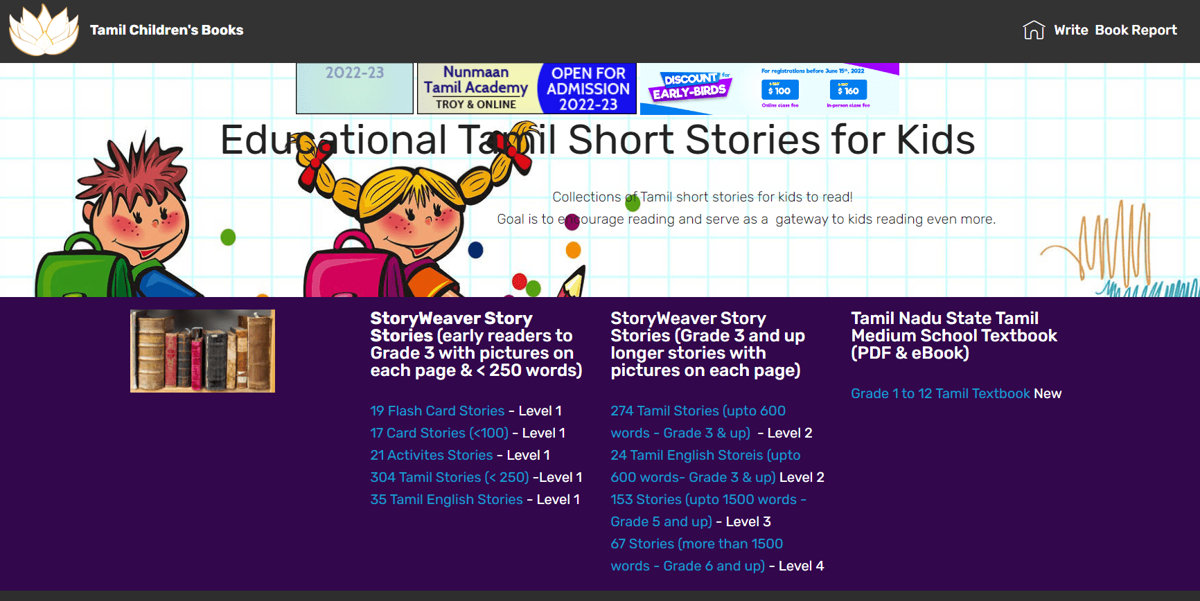 Tamilpalli contains various Tamil short stories for kids. It’s important for kids to read the language properly and understand the meaning of the language. By reading short stories kids can learn to read and understand the meaning. It has a link to many moral stories and Tamil StoryWeaver online books which really help the kids to learn the language easily.