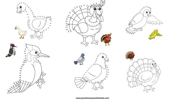 Birds are one of the kid’s favorite animals. They are very colorful and of different sizes from small to big. Here I have added 9 different bird pictures which are of partial dot-to-dot activity too. You can download them in a pdf format.