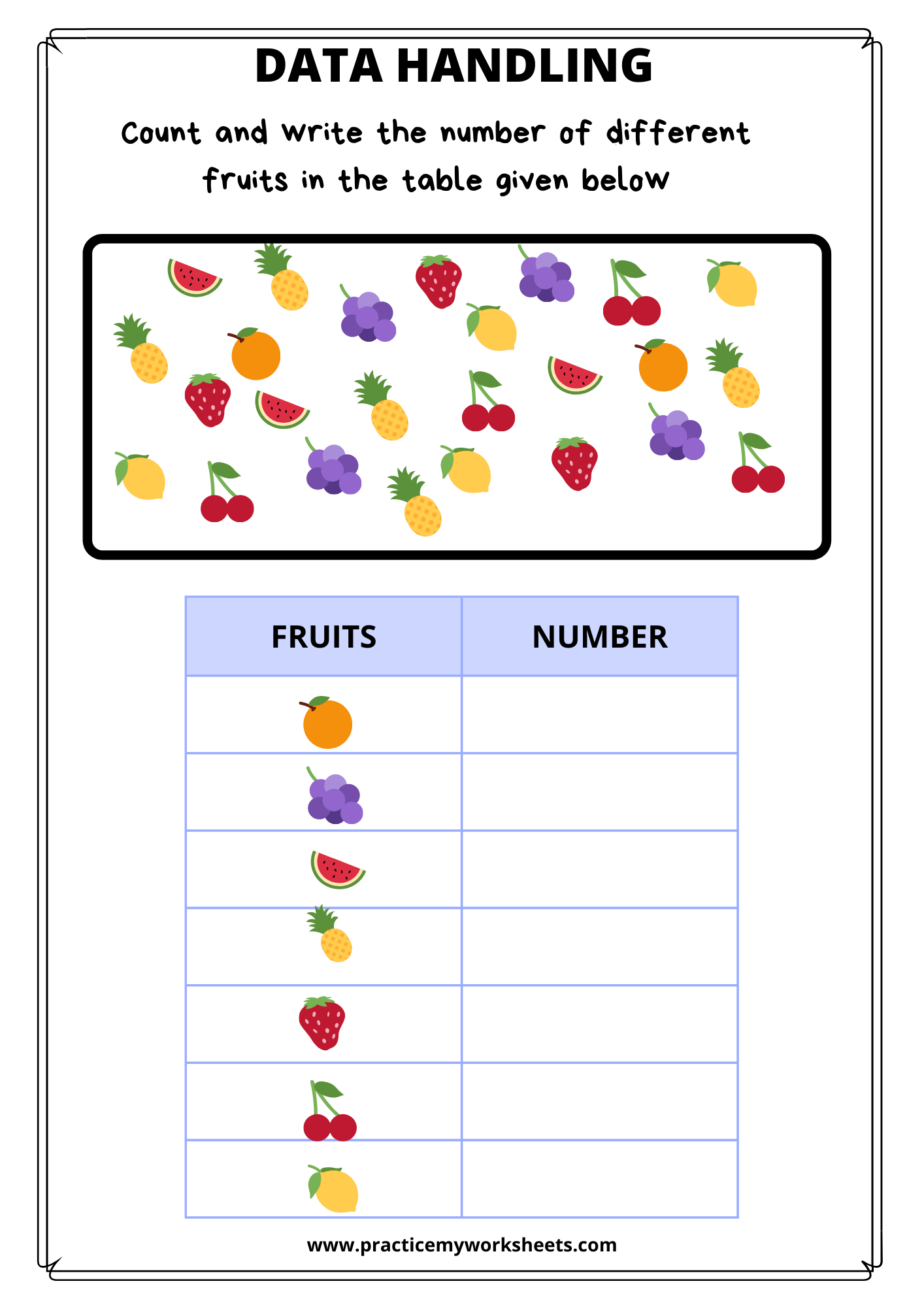 I have listed some fruits pictures randomly. Kids have to count and write the number of different fruits in the table given.