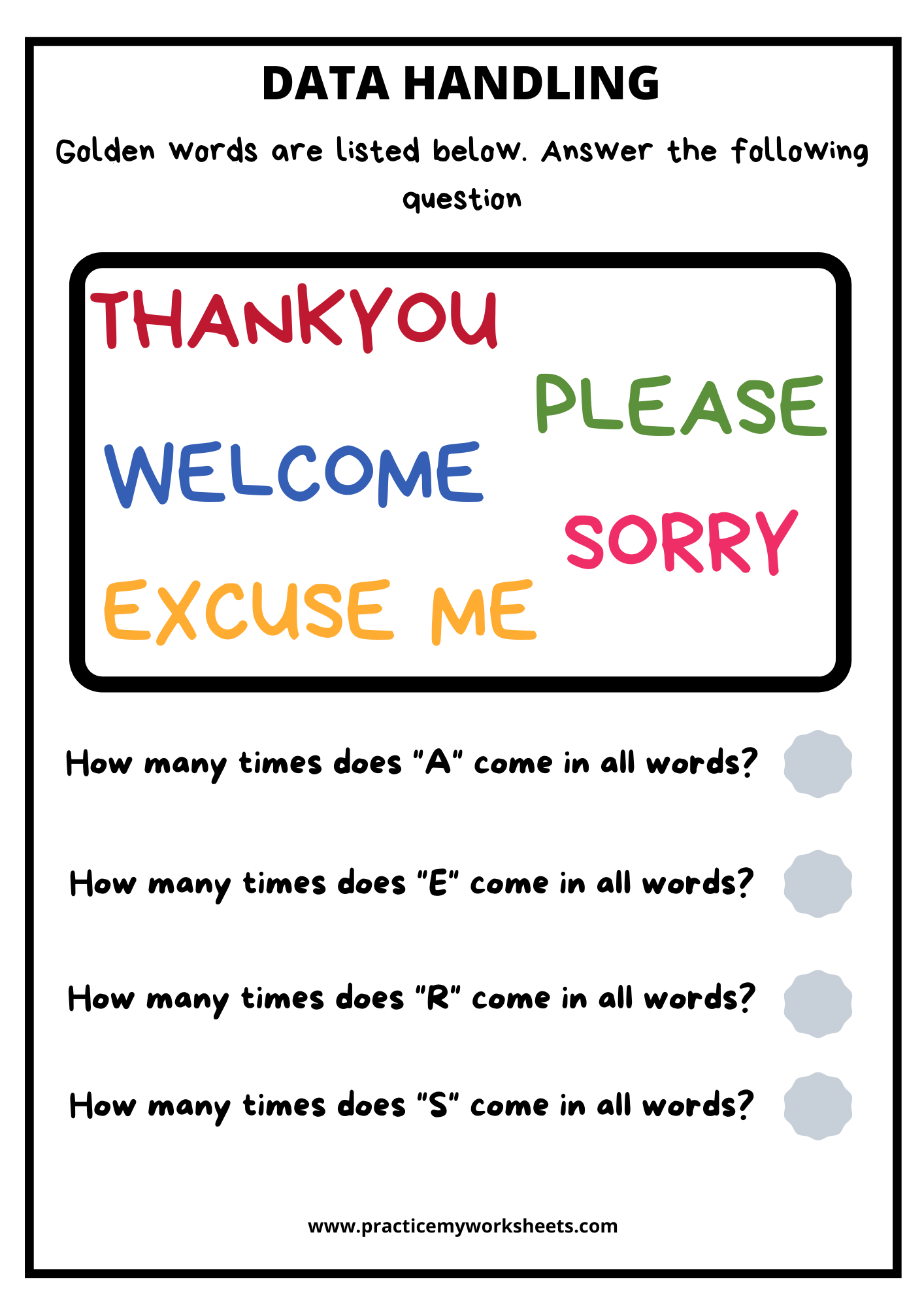 I have listed some golden words like thank you, please, welcome, sorry and excuse me. The kid has to read the question and answer them.