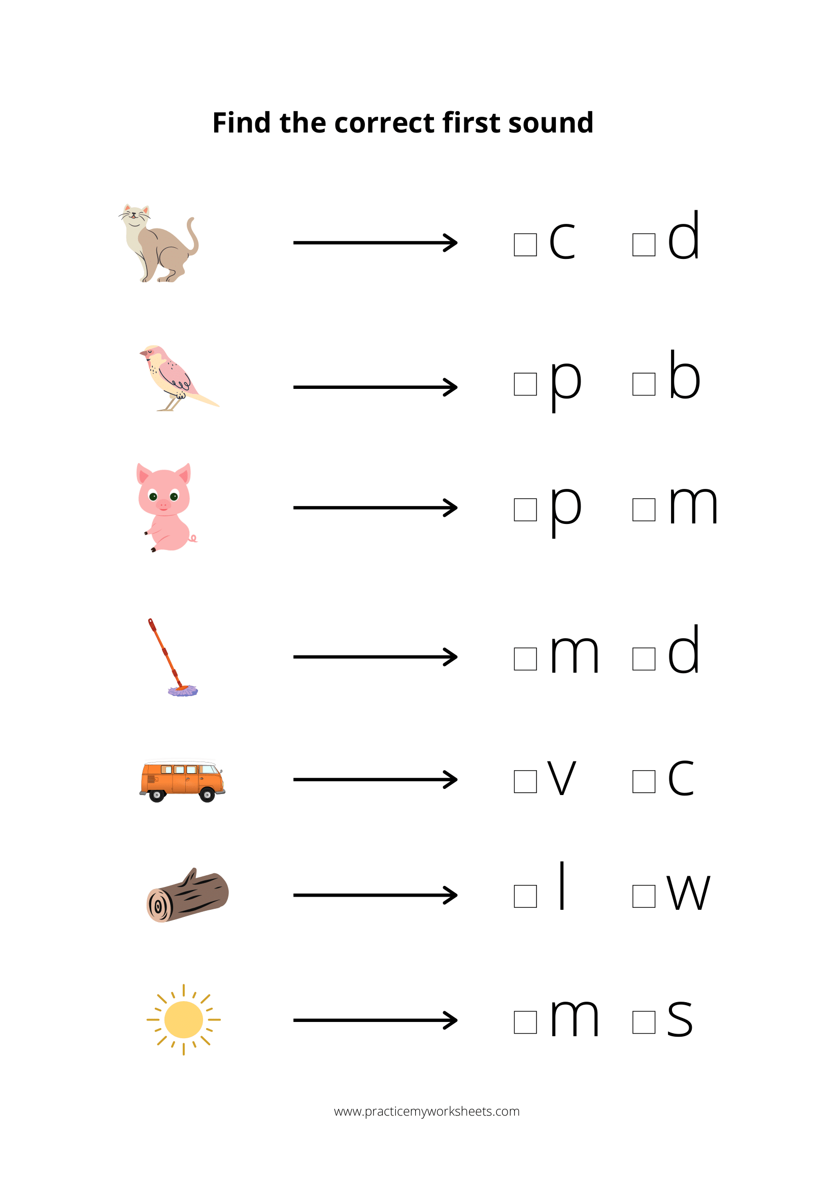 If a “cat” picture is given the kid should find the first sound C correctly. Practice this worksheet by giving different objects.