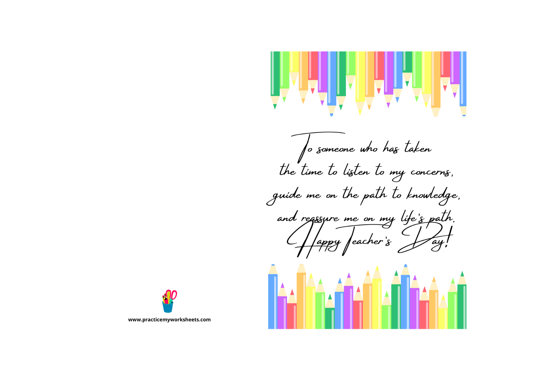 If you want your kid to make the card as an activity just take the printout on a standard A4 size paper. Ask your kid to stick it on a color chart or construction paper. Now let them cut around the paper outline. Fold the card and ask them to write their wishes or inspirational Teacher quotes inside the card. Now the card is ready to give to someone.