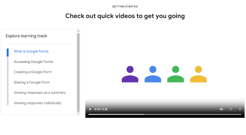 You have a stepwise clear learning videos for new commers where you can explore the learning tracks about what is Google Forms, how you can access, create, share and view responses as a summary or individually. You can explore more videos about tips and tricks from teachers lounge which will make you an expert.