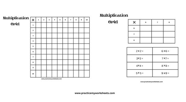There is two practice multiplication tables grid. In one grid all tables from 1 to 10 can be practiced. In the second one 6, 7, 8, and repeated numbers multiplication can be practiced.